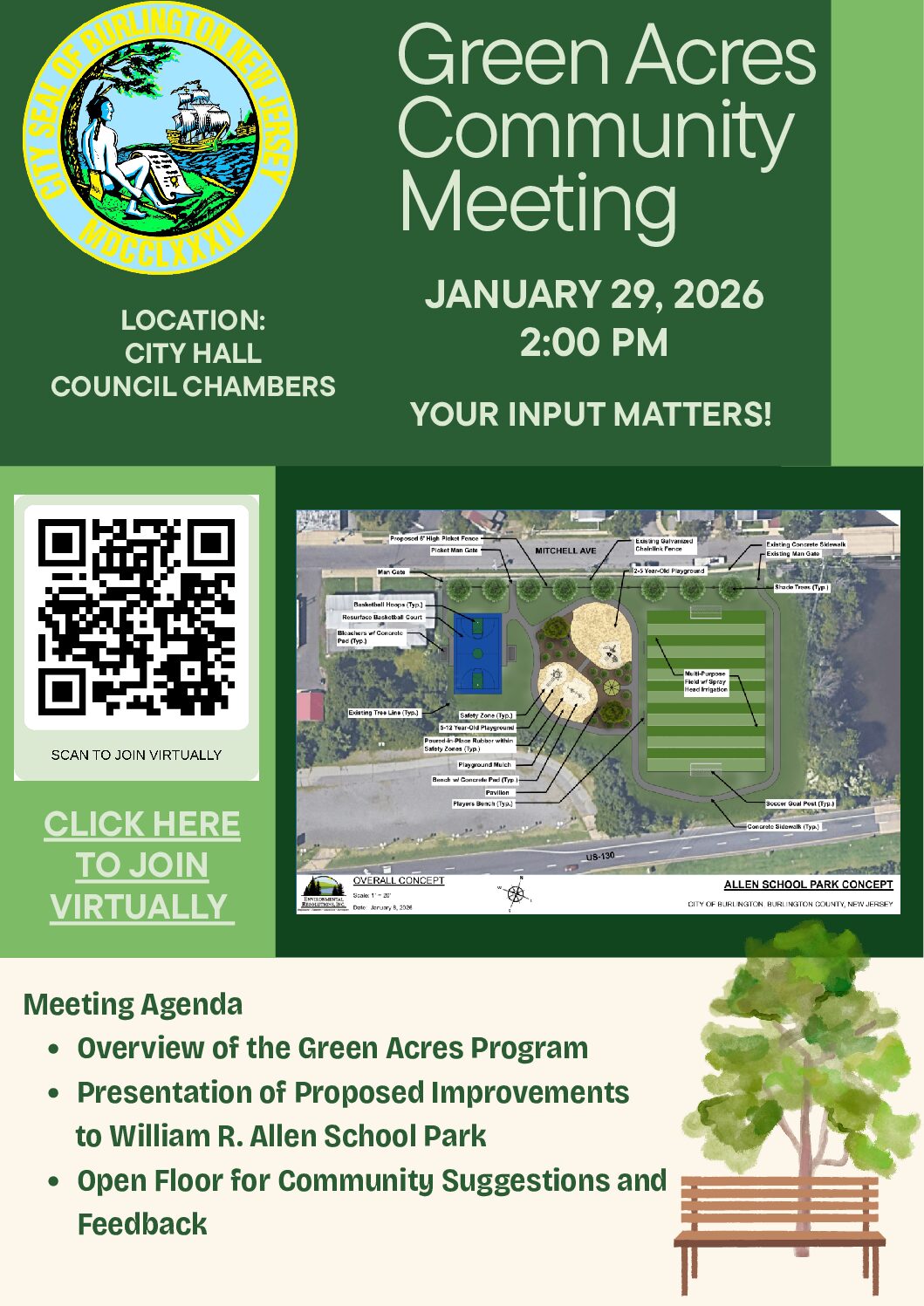 City Hall 525 High Street, Burlington, NJ, United StatesMeetings are held every 1st and 3rd Tuesday of the month, except in August, November, and December.