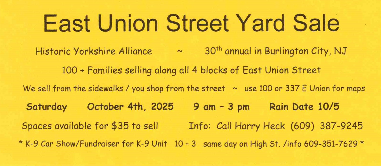 East Union Street East Union Street, Burlington, NJ, United StatesIn 2022, HYA raised close to $1976 from rents after all printing, materials, and ad costs. The proceeds are given back to the Historic Yorkshire community by way of scholarships, biannual potlucks, and other in-need giving. (RESCHEDULED to Saturday, October 5th from 9am to 3pm with a Rain Date of Sunday, October 6th)