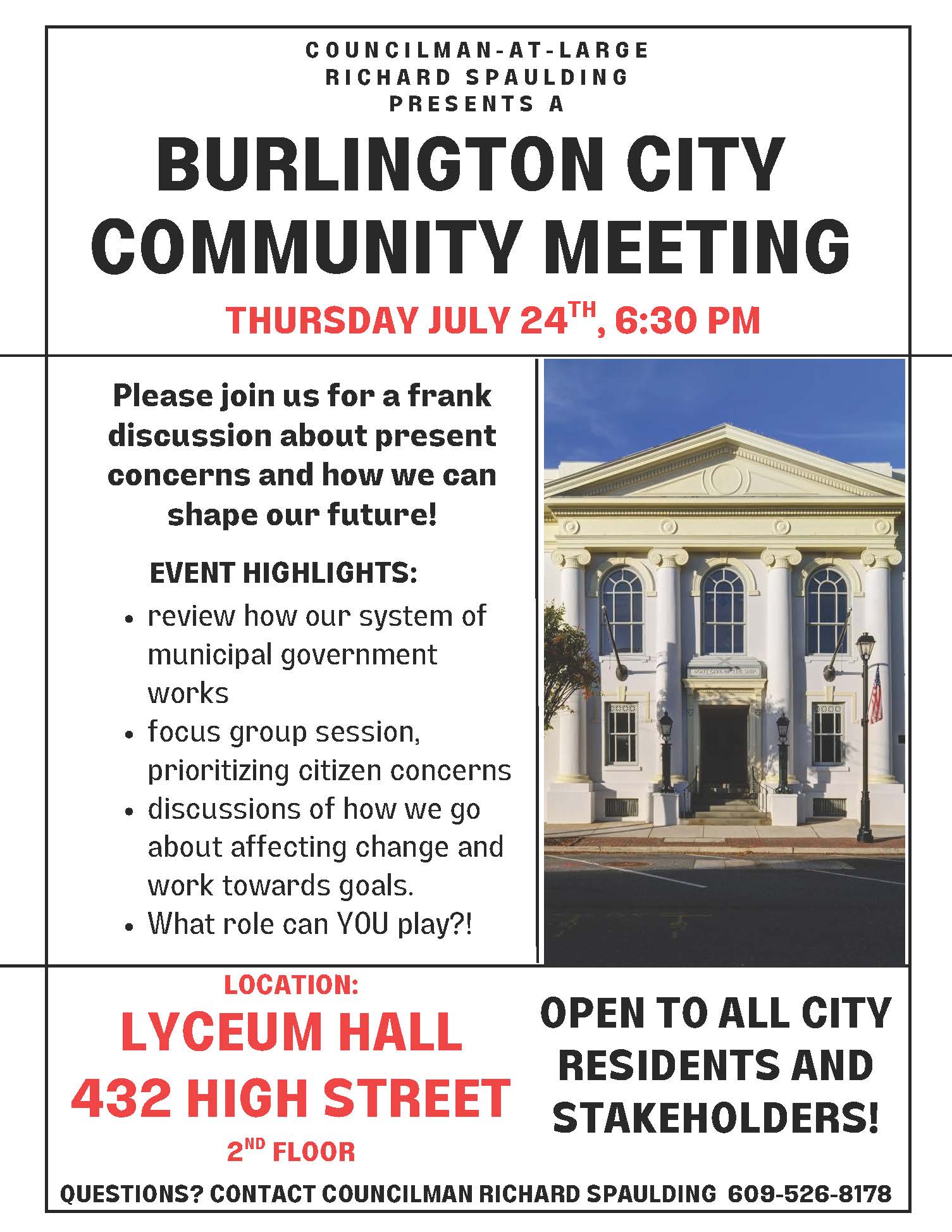 July 24 @ 6:30 pm - 8:00 pm Council Community Meeting H.T. Costello Lyceum Hall 432 High Street, Burlington City (Burlington County, NJ), NJ, United States